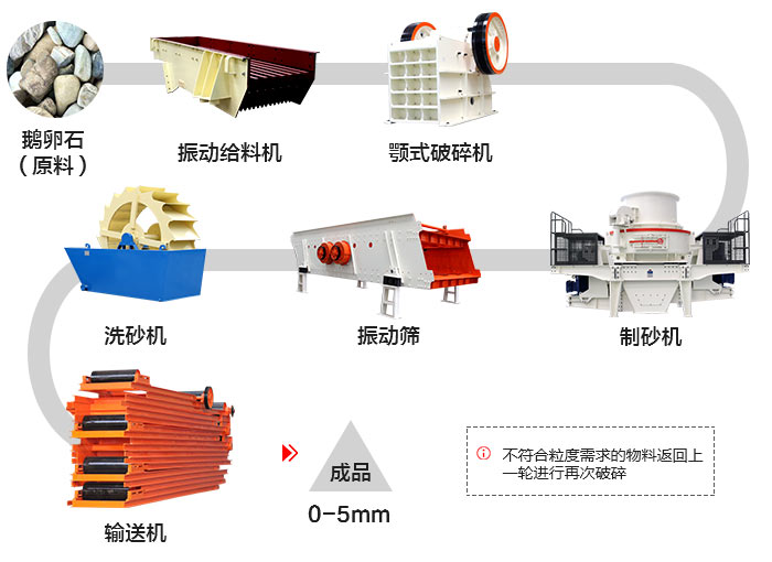 大塊的鵝卵石需要粗碎后才可以進(jìn)入細(xì)碎機(jī)進(jìn)行細(xì)碎,細(xì)碎粒度合適的鵝卵石被送入制砂機(jī)進(jìn)行細(xì)碎加工,制砂后的鵝卵石由圓振篩進(jìn)行篩分,較大粒級鵝卵石返送至制砂機(jī)再次破碎,符合需求的則由皮帶機(jī)送至儲料堆貯存制成鵝卵石砂子的物料被送入洗砂機(jī)清洗,清洗后,作為最終產(chǎn)品的一部分,由皮帶機(jī)傳送至儲料堆進(jìn)行包裝